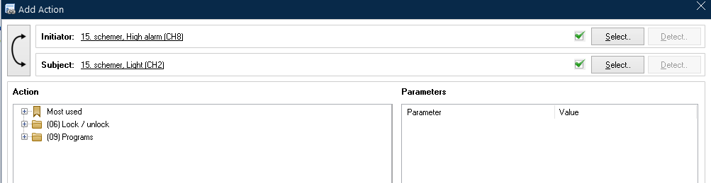 How to AND the “Alarm 1” from the glass panel with the “High alarm” from the PIRO so that the blind goes down when BOTH conditions are met ? Two actions 110. Down